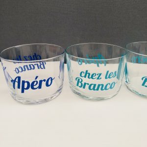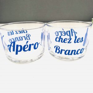 - Assortiment composé de 1 bouteille, 1 bouteille et 1 verre, 2 paires de verres differents, 2 mots “APERO”, 2 mots “chez les”, 2 mots “nom de famille personnalisé”.